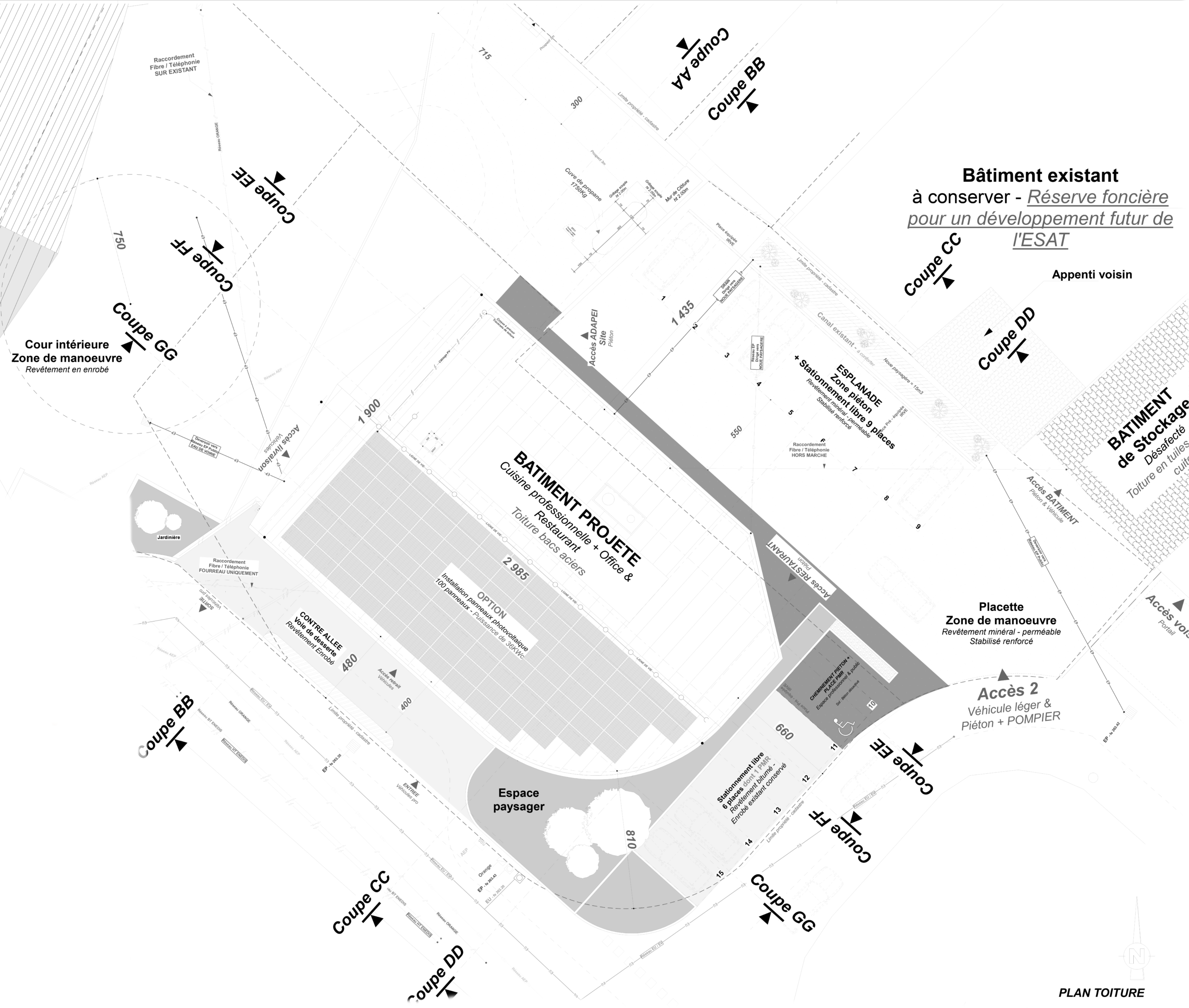 Le projet comprend la création d’une cuisine centrale d’une capacité de 500 repas/jours, avec pour objectif la production de repas journaliers à destination de plusieurs entités publiques ou privées (EHPAD, écoles, etc.). Ce programme est complété par des lieux dédiés à l’accueil du public : un espace office et une salle de restaurant. Par sa morphologie et son architecture, l’opération oriente et organise ainsi des flux diversifiés, du personnel de production habitué du site jusqu’aux visiteurs venant de l’extérieur.