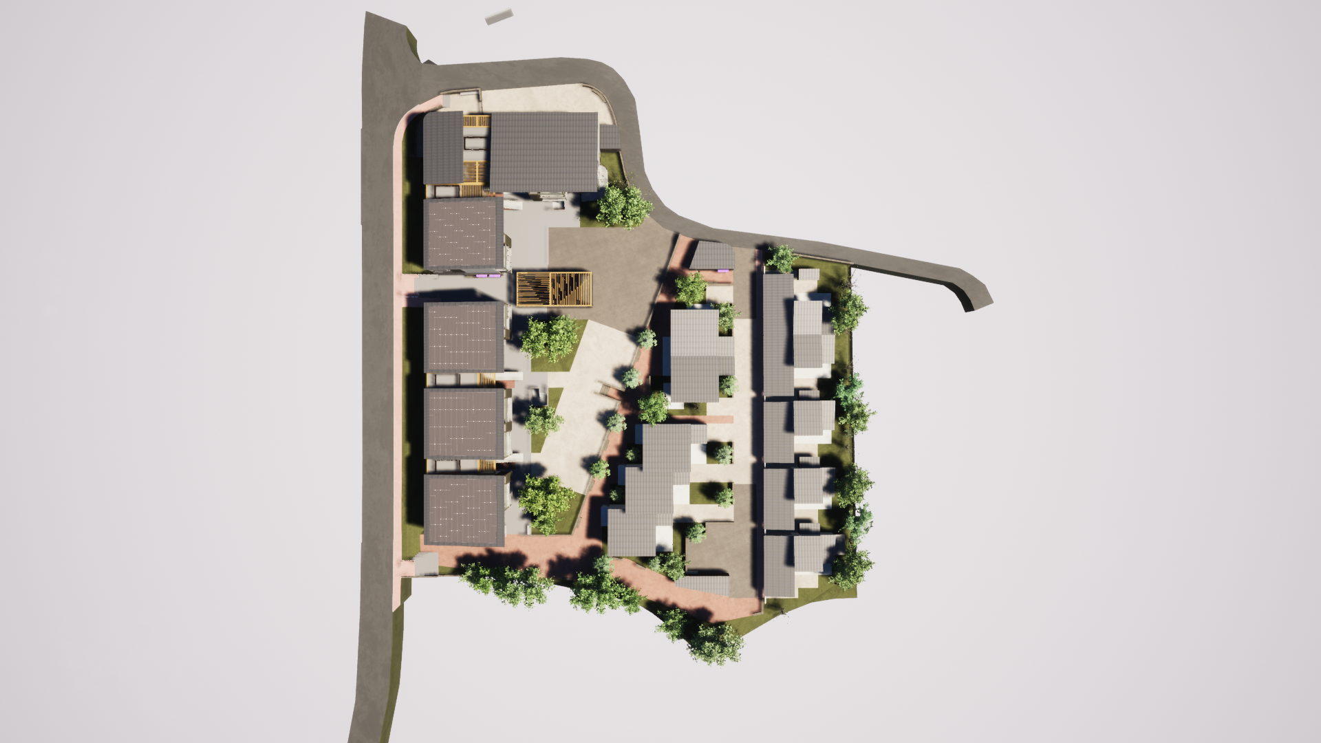 Par la mise en place d’un mail piéton et paysager, le projet se positionne comme une continuité urbaine entre le centre du village historique et l’entrée de la ville. Le cœur d’îlot est protégé par les bâtiments dont la morphologie et l’implantation génèrent un front bâti le long de la départementale D104. Des porosités favorisent les vues vers le grand paysage et se transforment, dans les étages, en terrasses pour les logements. Ces espaces extérieurs non-chauffés constituent les séquences d’entrée pour les appartements qui sont tous traversants.